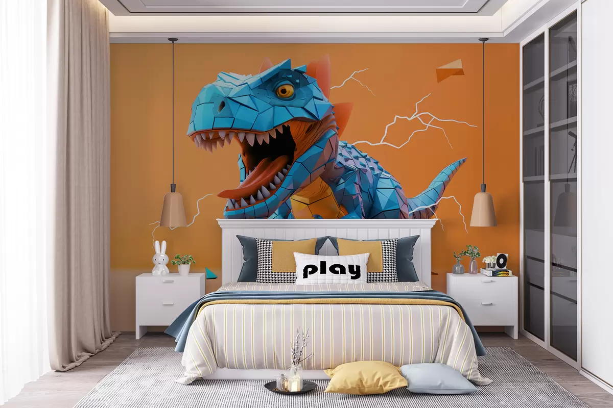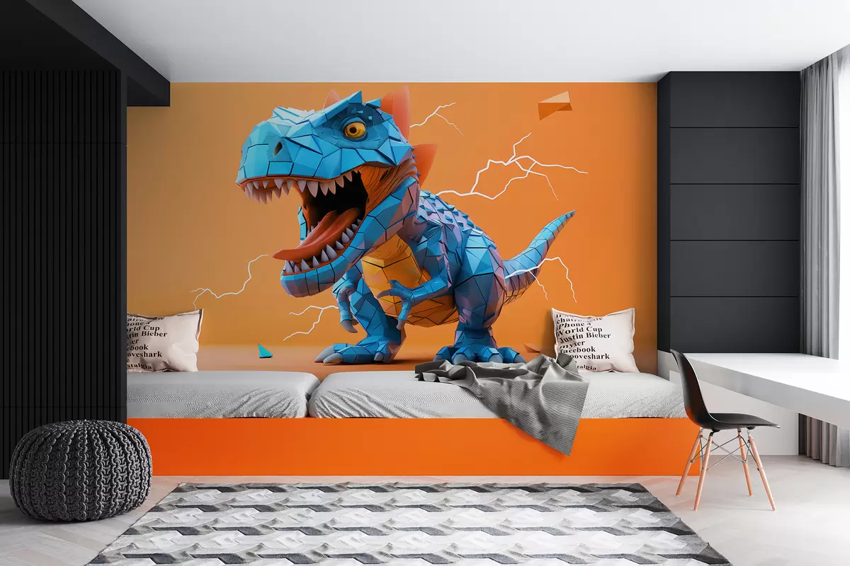 Fototapeter Grusom dinosaur med lynnedslag i gule og blå farger Nr. w01333v1