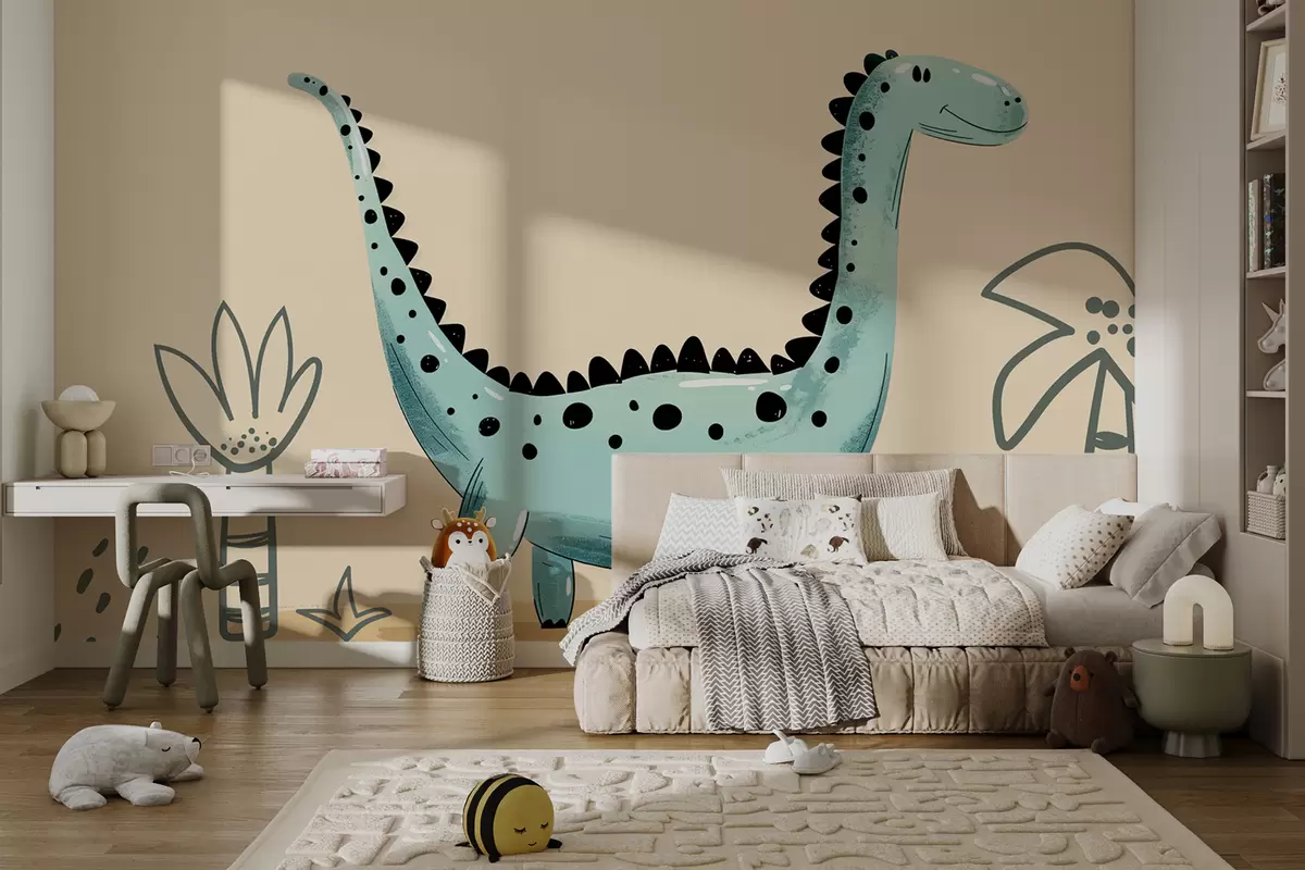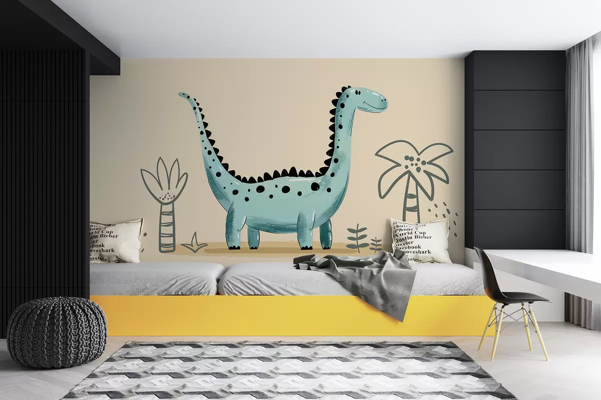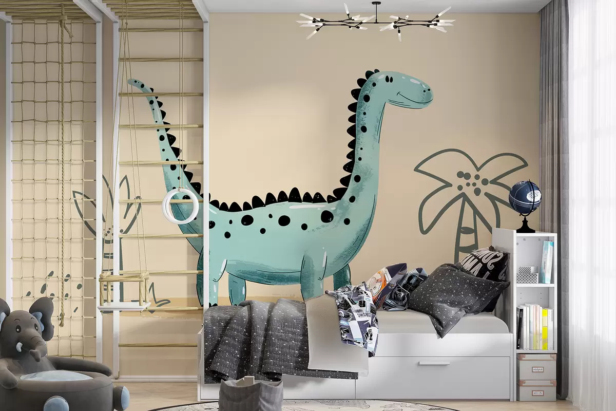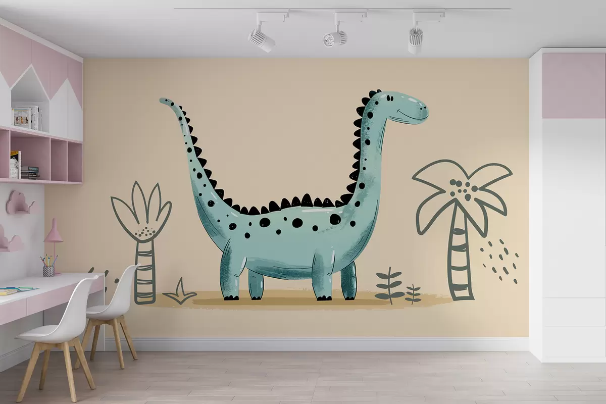Fototapeter Søt dinosaur på en beige bakgrunn med palmer Nr. w01357v1