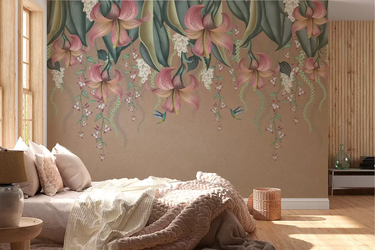 Fototapeter Delikat botanisk motiv med hengende liljer, blomster og kolibrier på en grunget vegg Nr. w01523