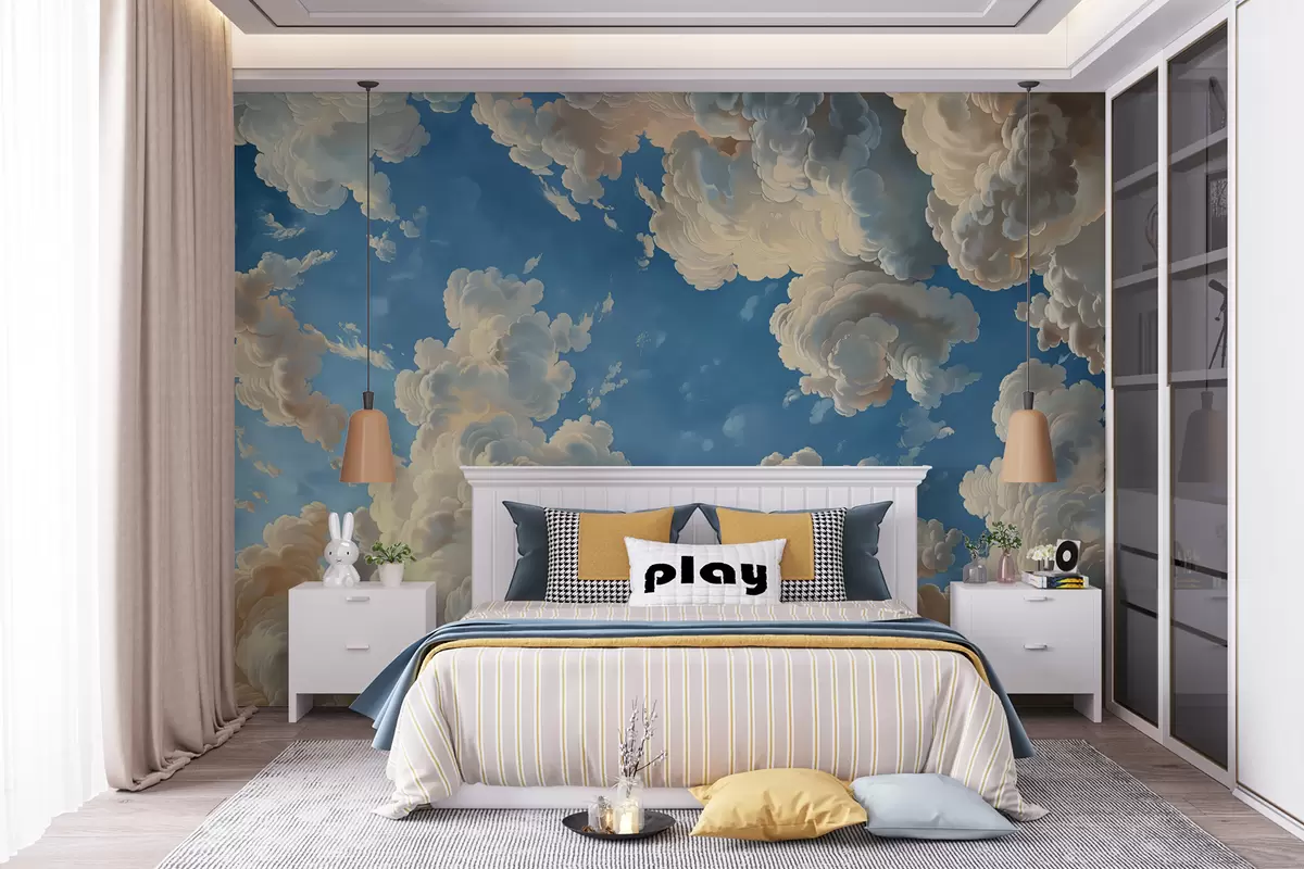 Fototapeter Bølgende skyer i varme toner af creme, blød fersken og blegt, levende blå himmel Nr. w01583