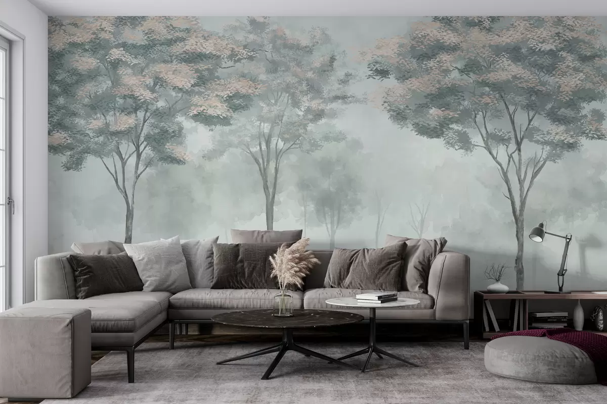 Fototapeter Tåkete skogssilhuett i grønne, lysegrå og beige farger Nr. w01599