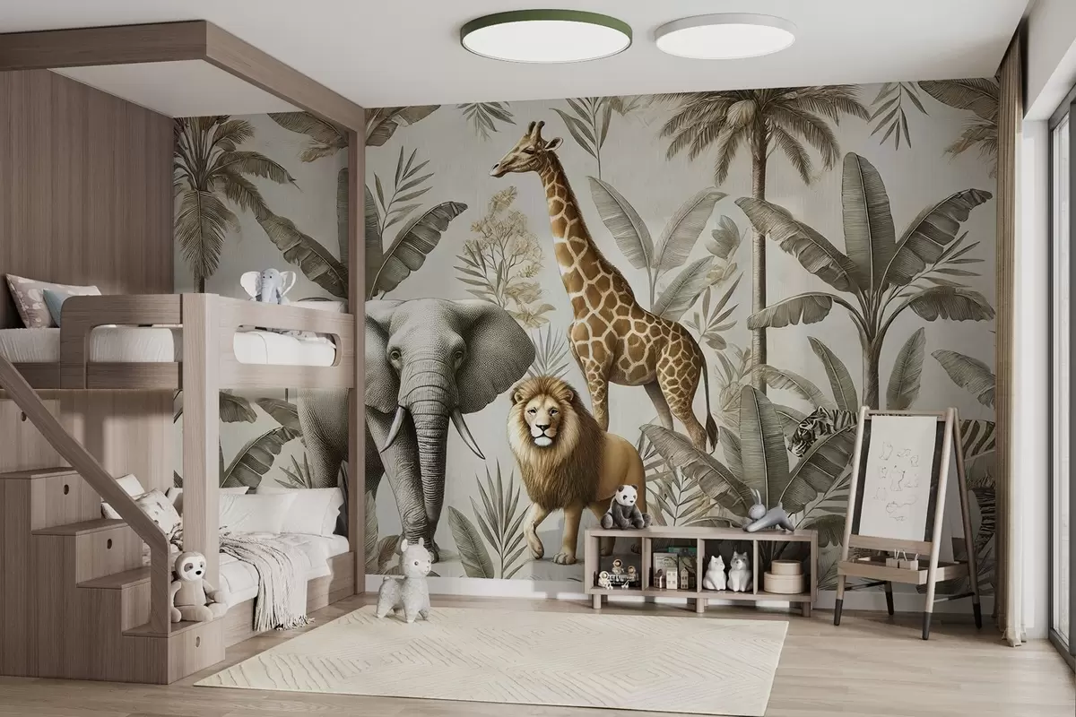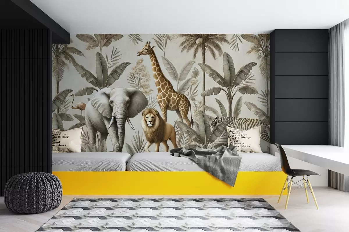 Fototapeter Safari-bakgrunnsbilde for barn med tropisk landskap og ulike dyr i elegante farger Nr. w01956