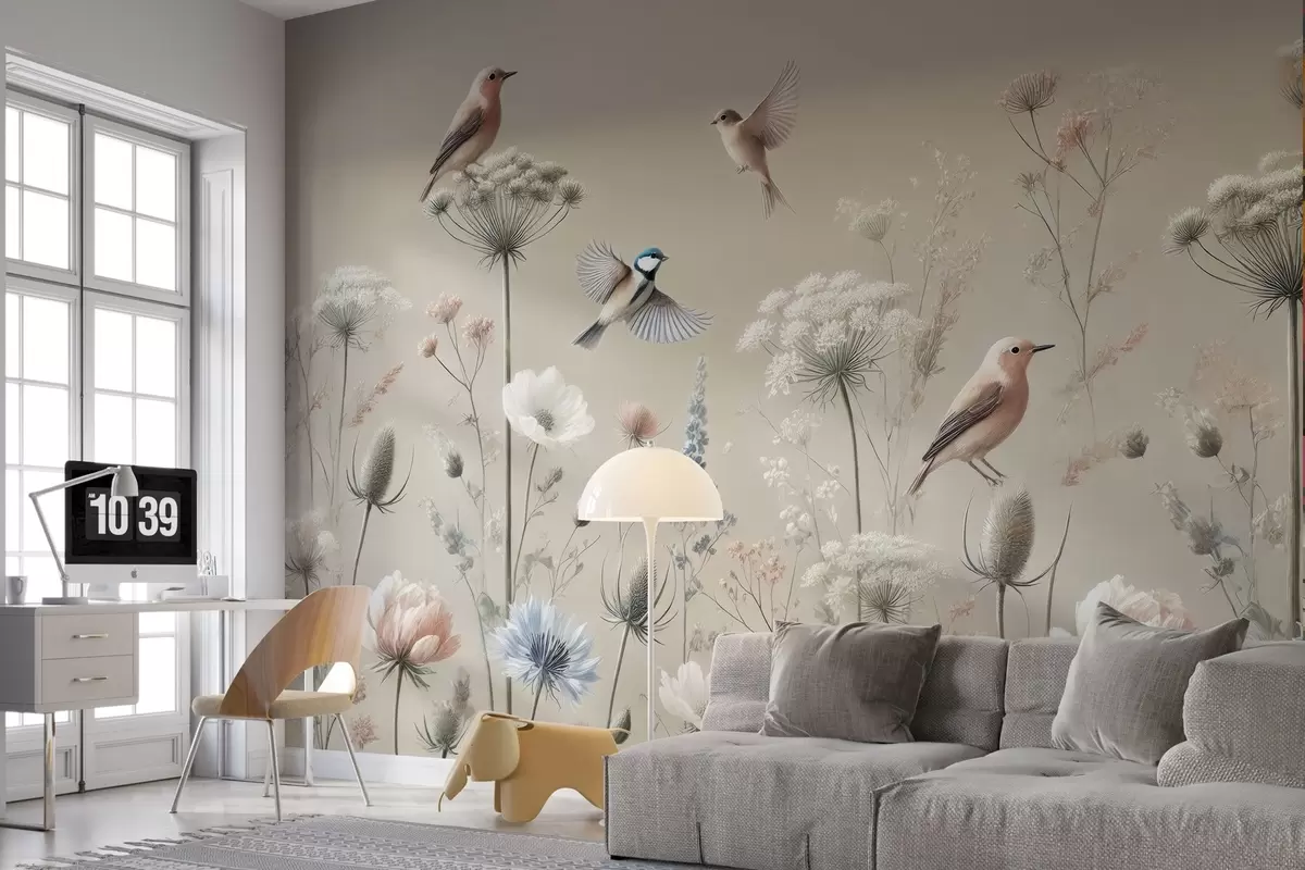Fototapeter Delikate villblomster med fugler på beige bakgrunn Nr. w01958