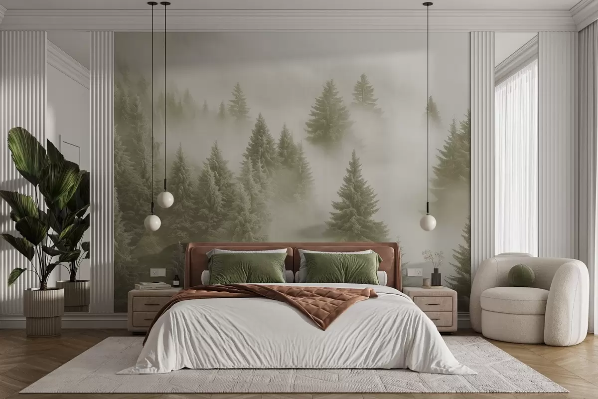 Fototapeter Tykk tåke omslutter en snøkledd morgenskog i myke, grønne nyanser Nr. w02064v2