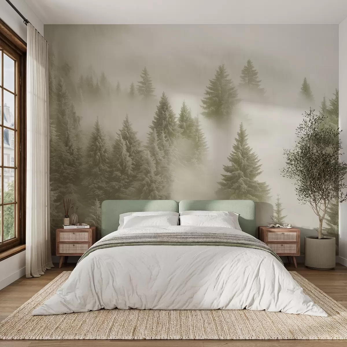 Fototapeter Tykk tåke omslutter en snøkledd morgenskog i myke, grønne nyanser Nr. w02064v2