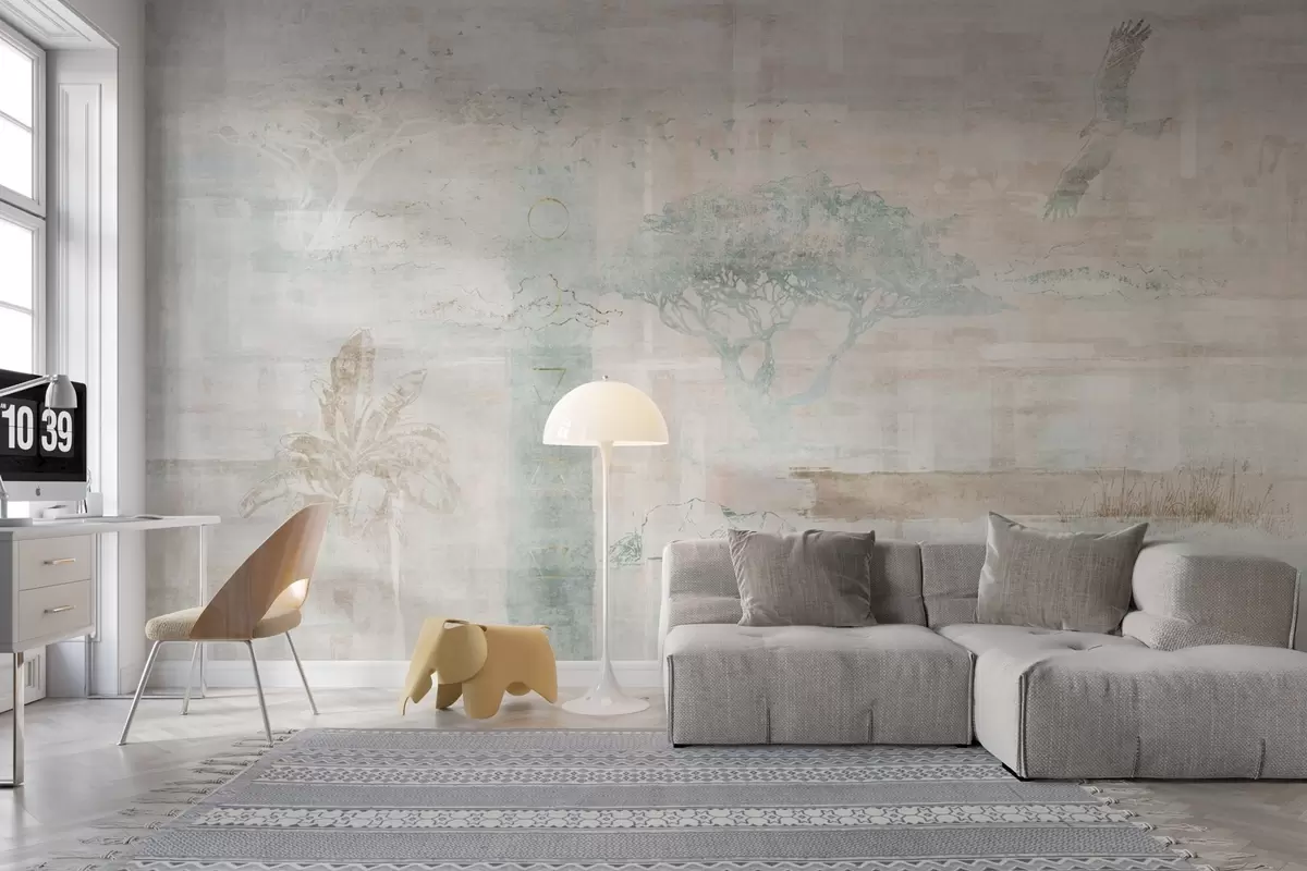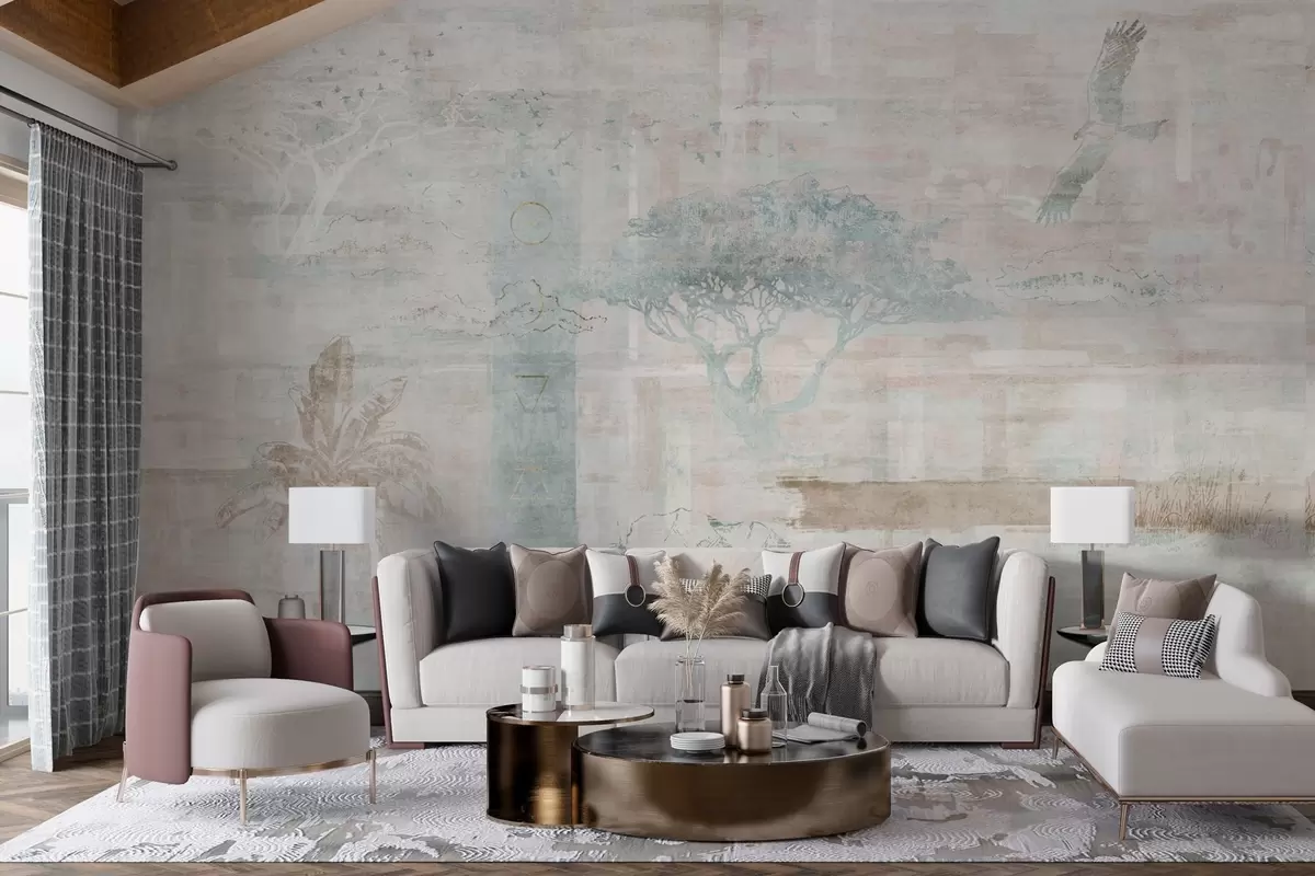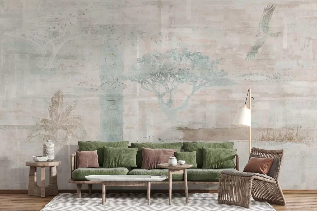Fototapeter Vintage grunge-effektdesign med trær, ørn og geometriske elementer Nr. w02130