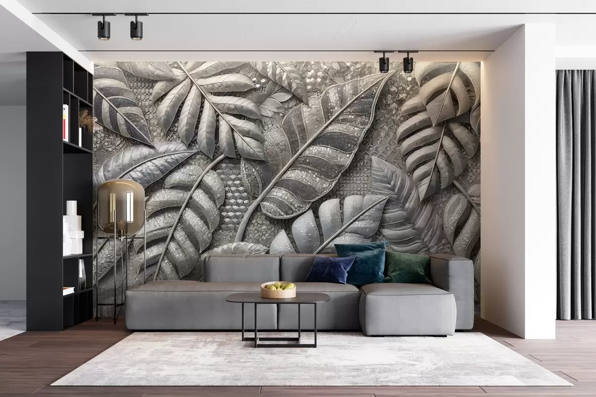Fototapeter Store tropiske blader i delikate sølvfarger, i en strukturert mosaikkstil Nr. w02135