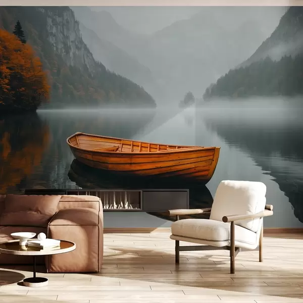 Fototapeter En trebåt flyter på en innsjø, omgitt av tykk tåke og fjell i bakgrunnen Nr. w02195