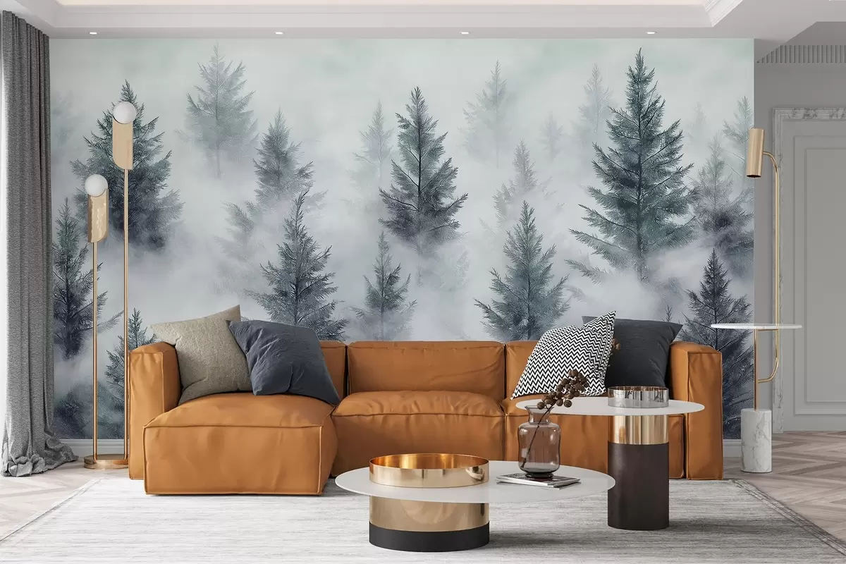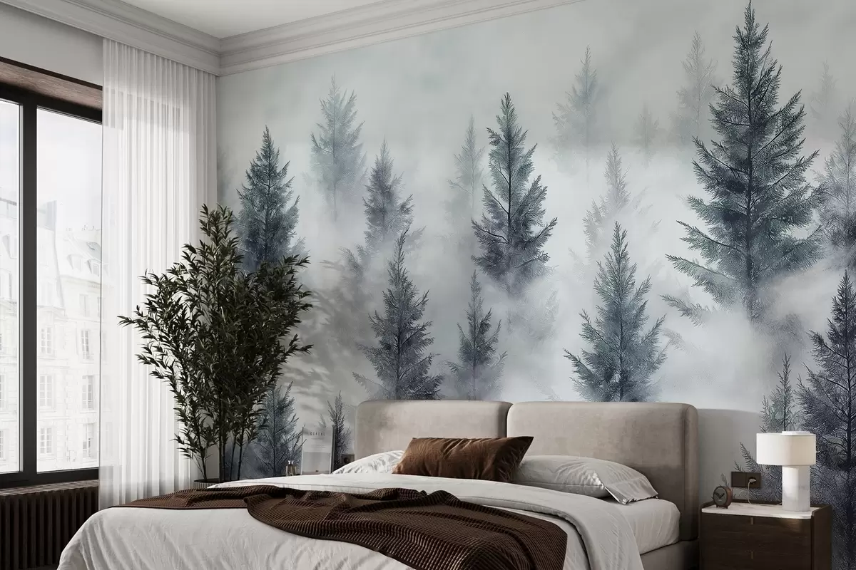 Fototapeter Vakker skog med furutrær, tåke, naturlandskap, grå farger Nr. w02222v2