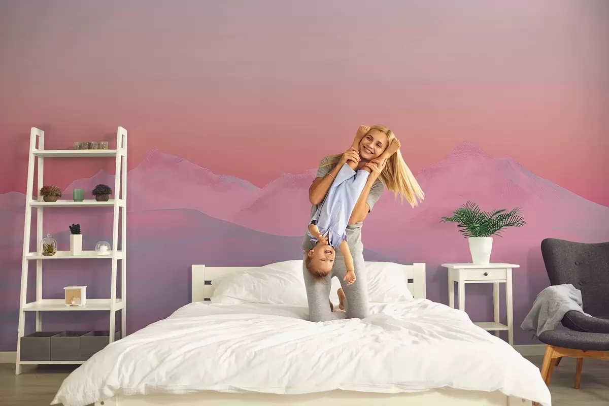 Fototapeter Myk bringebærsolnedgang med fjell og himmel som bakteppe Nr. w02234