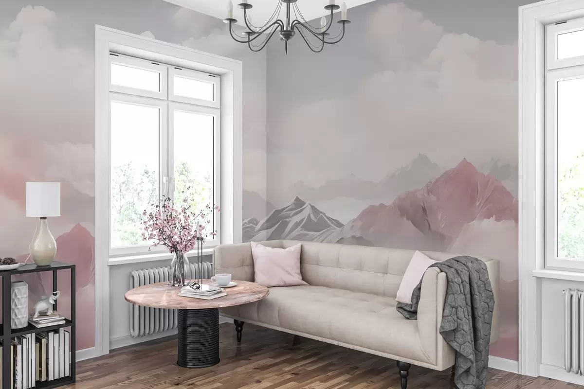 Fototapeter Rosa fjell i tåke og oppblåste skyer Nr. w02296