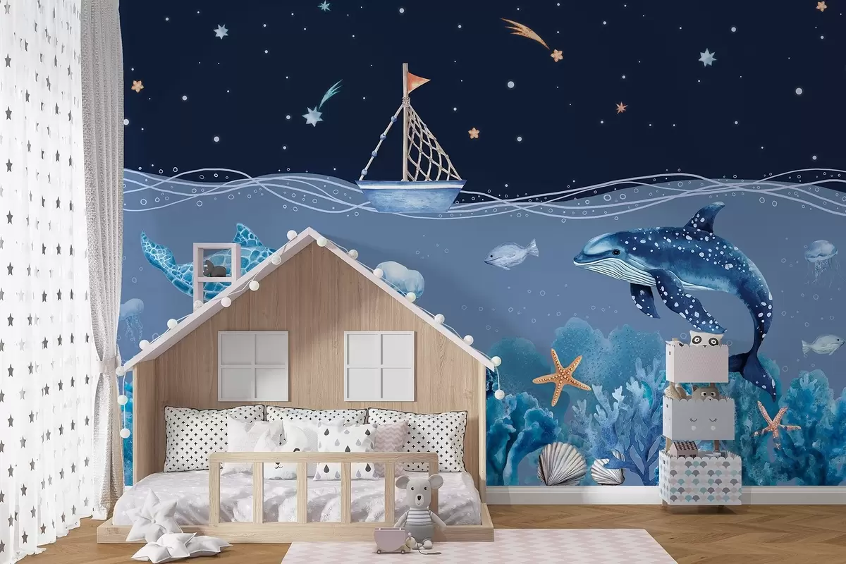 Fototapeter Havliv, akvarellstil, koraller, båt, delfin, maneter, stjernehimmel, blå farger Nr. w02310