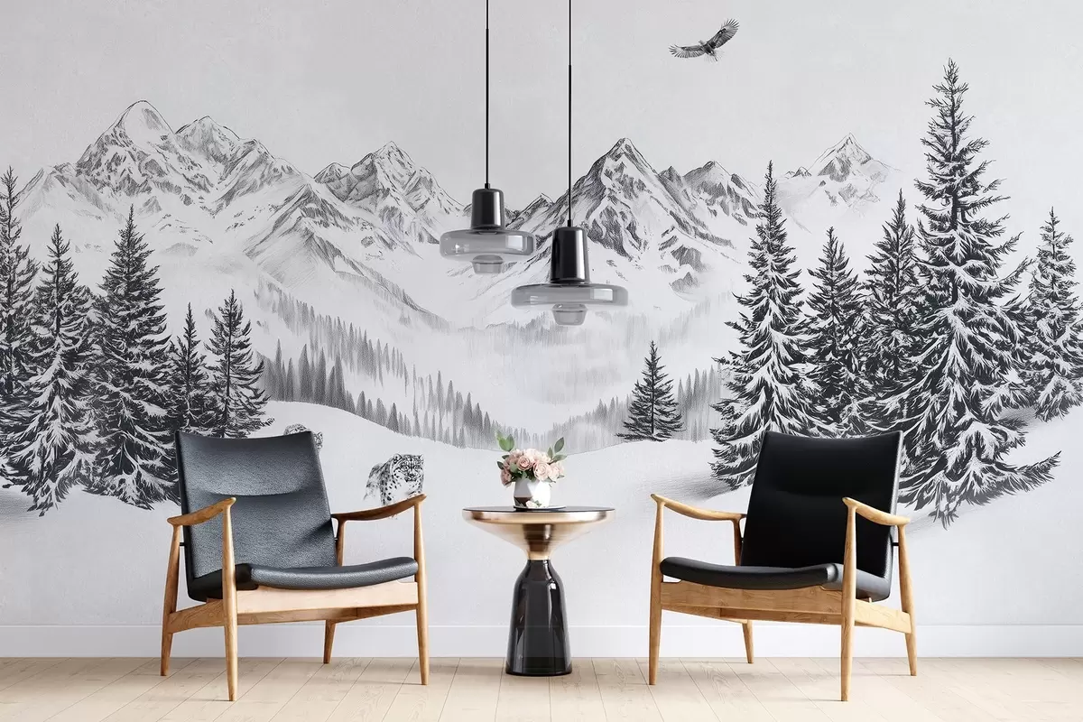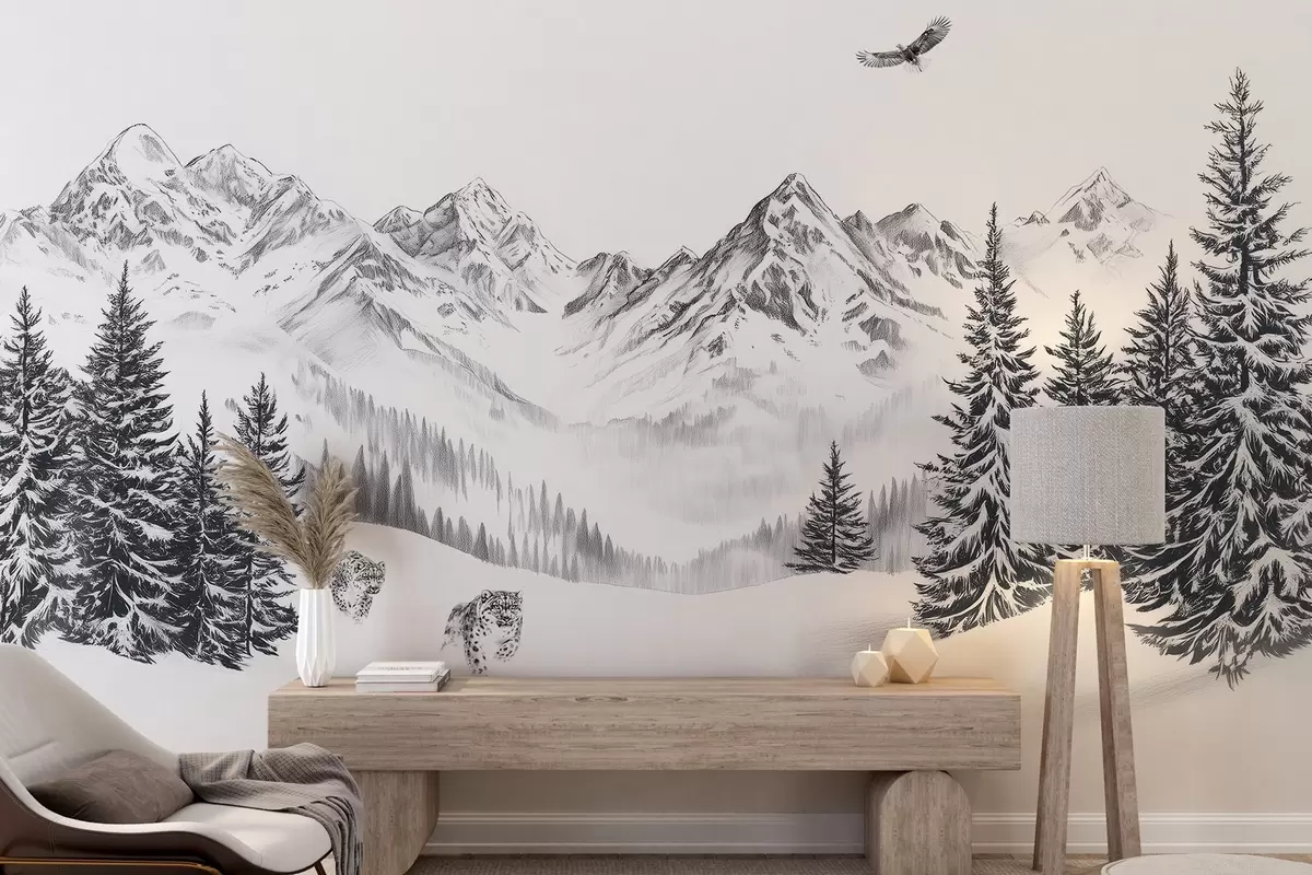 fototapeter Vinterfjell, snøleoparder, furuskog, blyanttegning, flygende ørn w02360