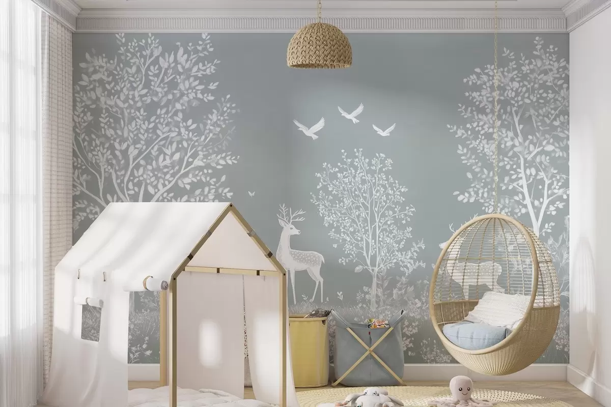Fototapeter skog med hjort i stil med en kritttegning på en grå bakgrunn Nr. w02444v2