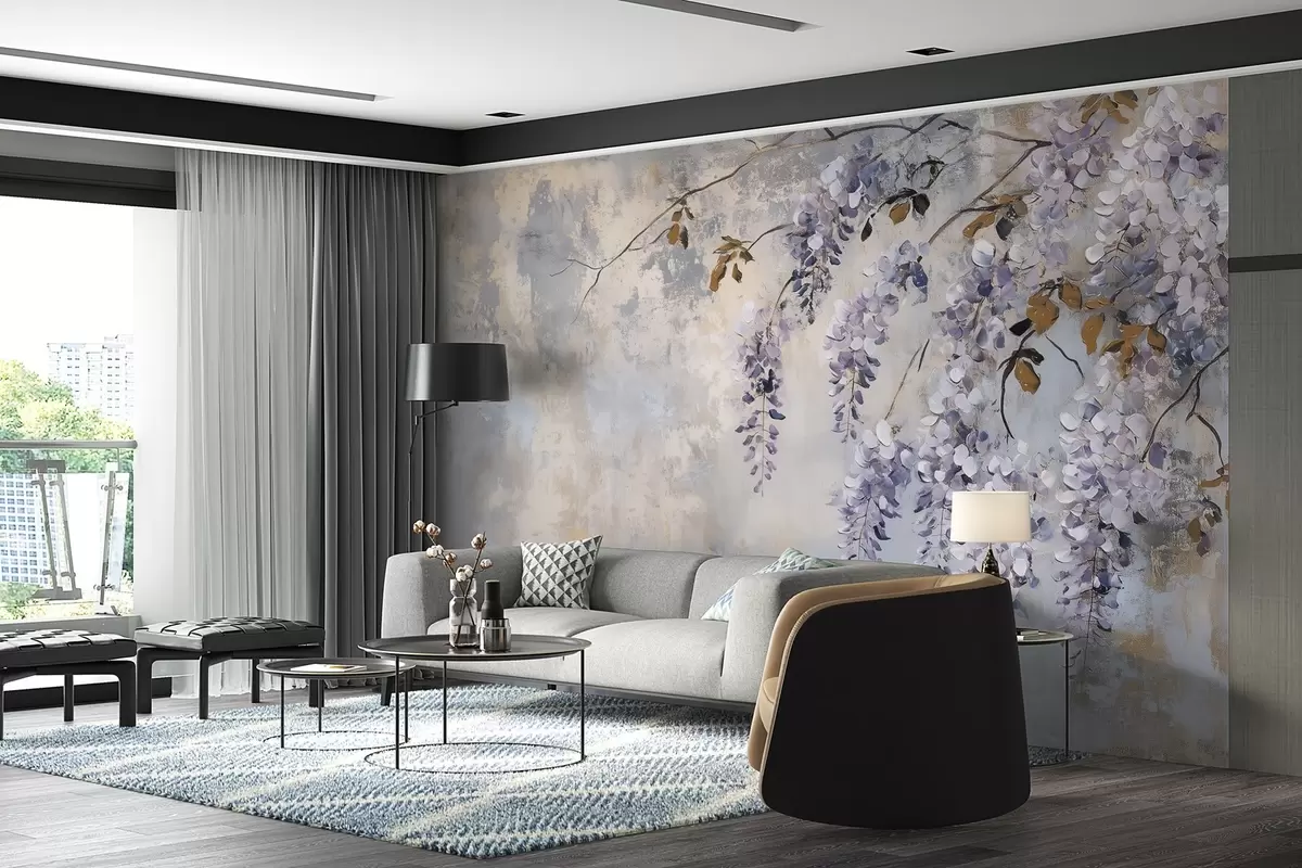Fototapeter strukturtapet i myke, dempede farger med delikate blåregnblomster og -grener. Nr. w02451