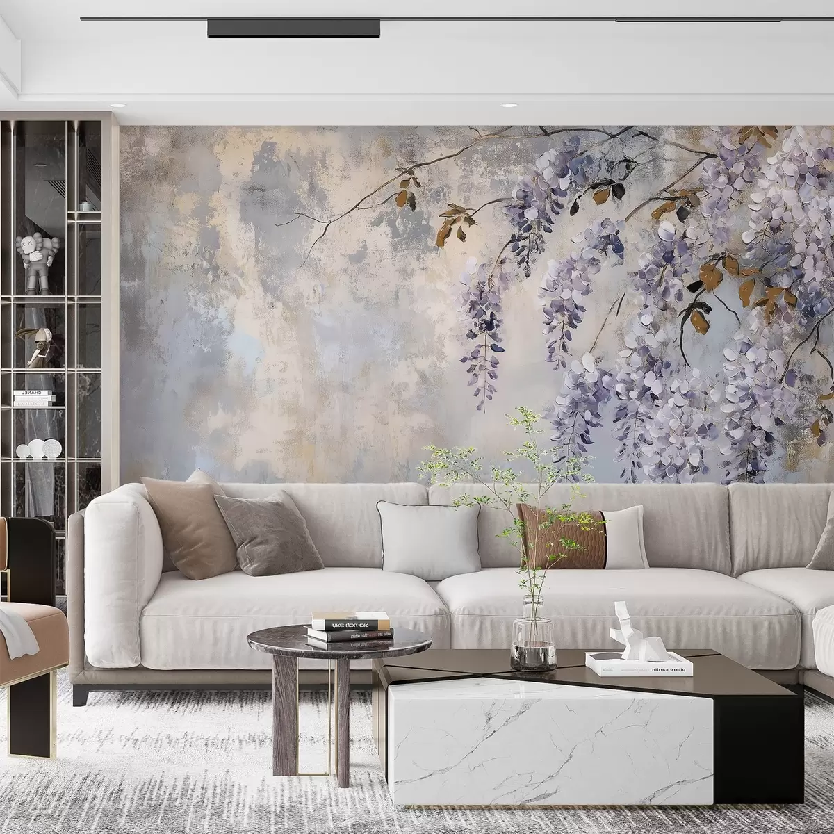 Fototapeter strukturtapet i myke, dempede farger med delikate blåregnblomster og -grener. Nr. w02451