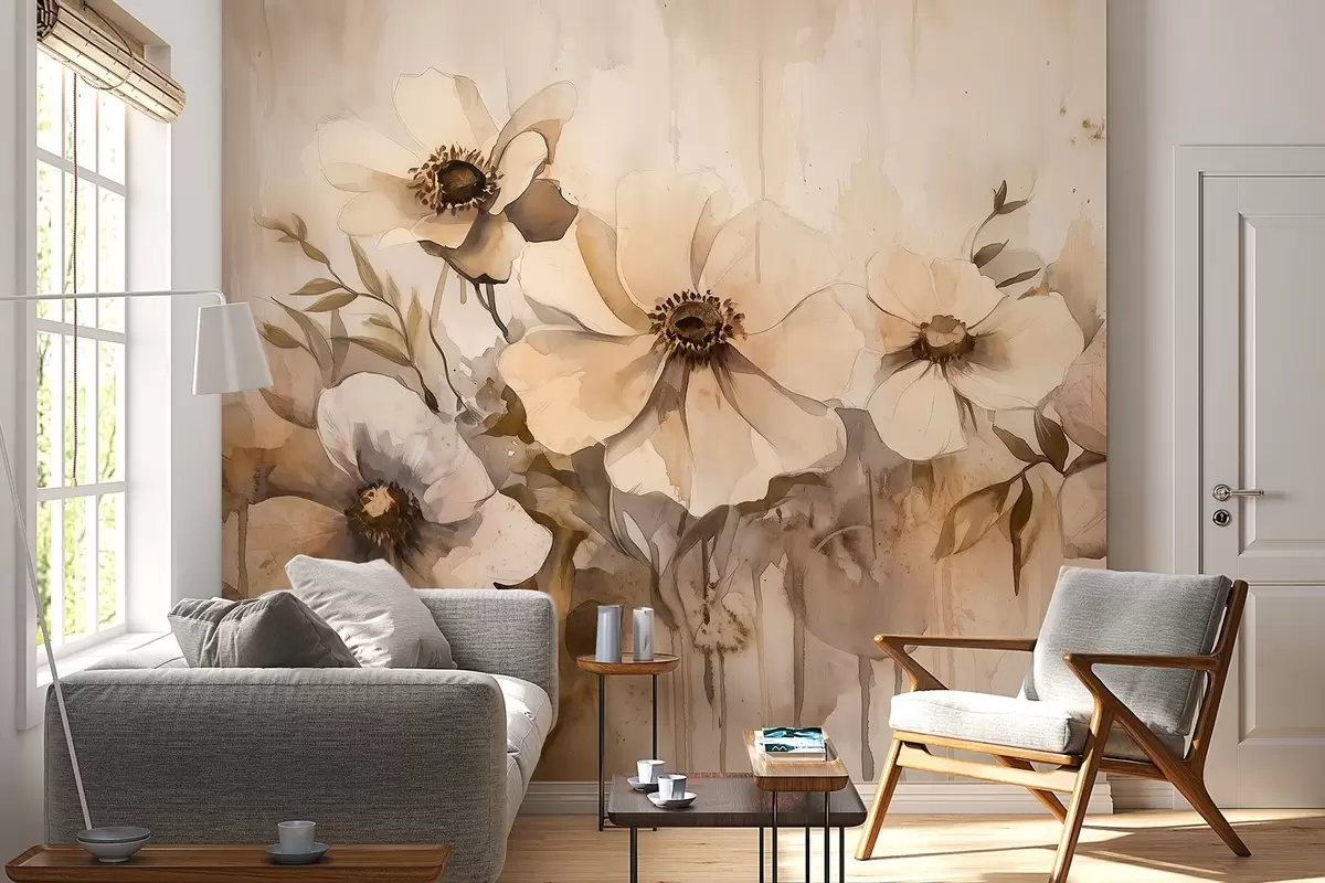 Fototapeter Rustikke blomster, akvarellstil tegning, beige farger Nr. w02487