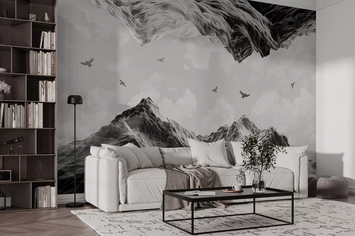 Fototapeter Fjell landskap, realisme, flygende fugler, natur, skyer, svart-hvite farger Nr. w02514