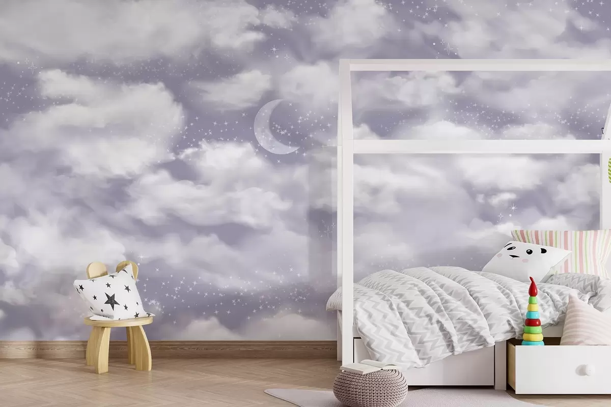 Fototapeter Stjernehimmel med måne og skyer, drømmende, eteriske, myke lilla farger Nr. w02515v4