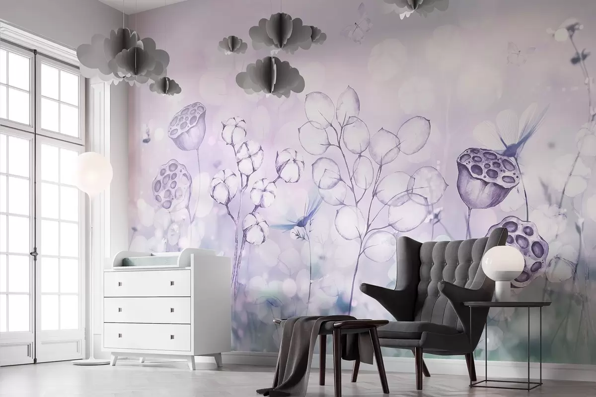 Fototapeter Drømmende blomsterhage, sommerfugl, bomullsblomster, lotusblomster, lilla farger Nr. w02516v1