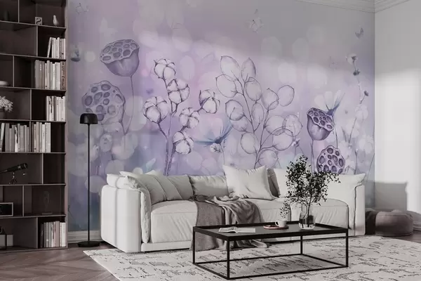 Fototapeter Drømmende blomsterhage, sommerfugl, bomullsblomster, lotusblomster, lilla farger Nr. w02516v1