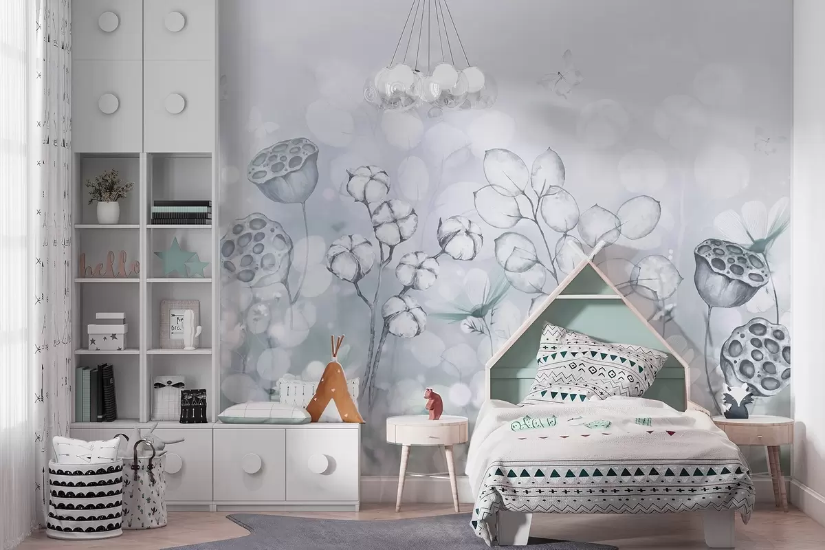 Fototapeter Drømmende blomsterhage, sommerfugl, bomullsblomster, lotusblomster, grå farger Nr. w02516v2