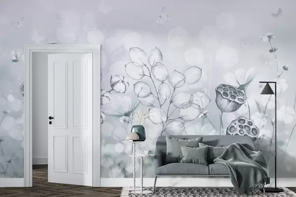 Fototapeter Drømmende blomsterhage, sommerfugl, bomullsblomster, lotusblomster, grå farger Nr. w02516v2