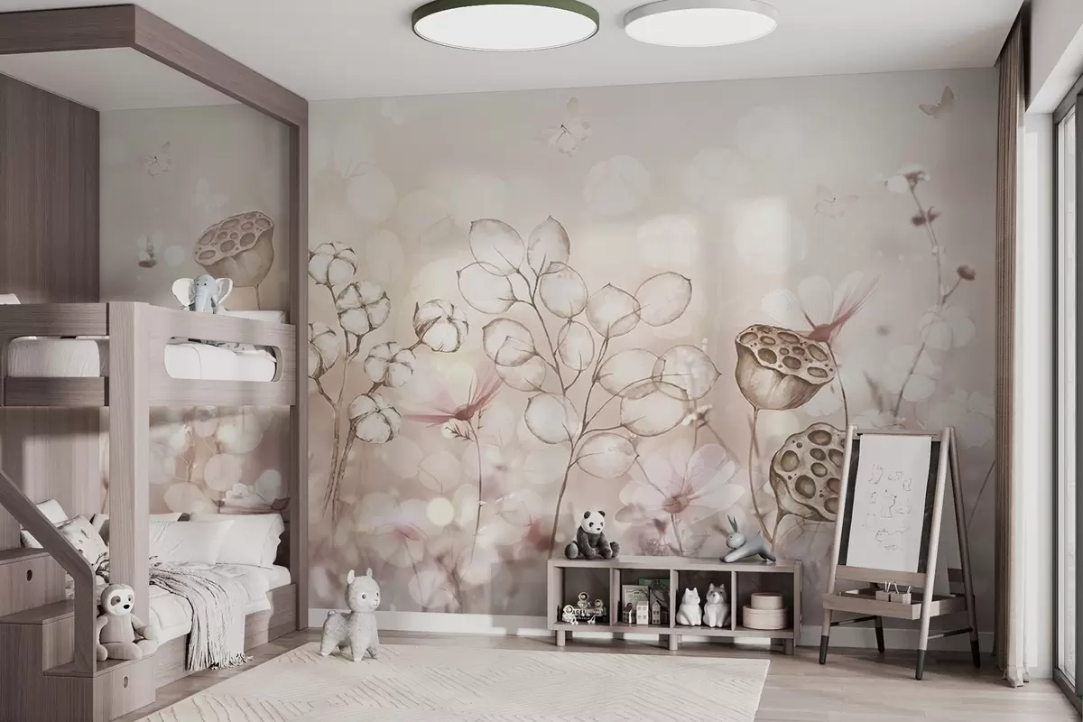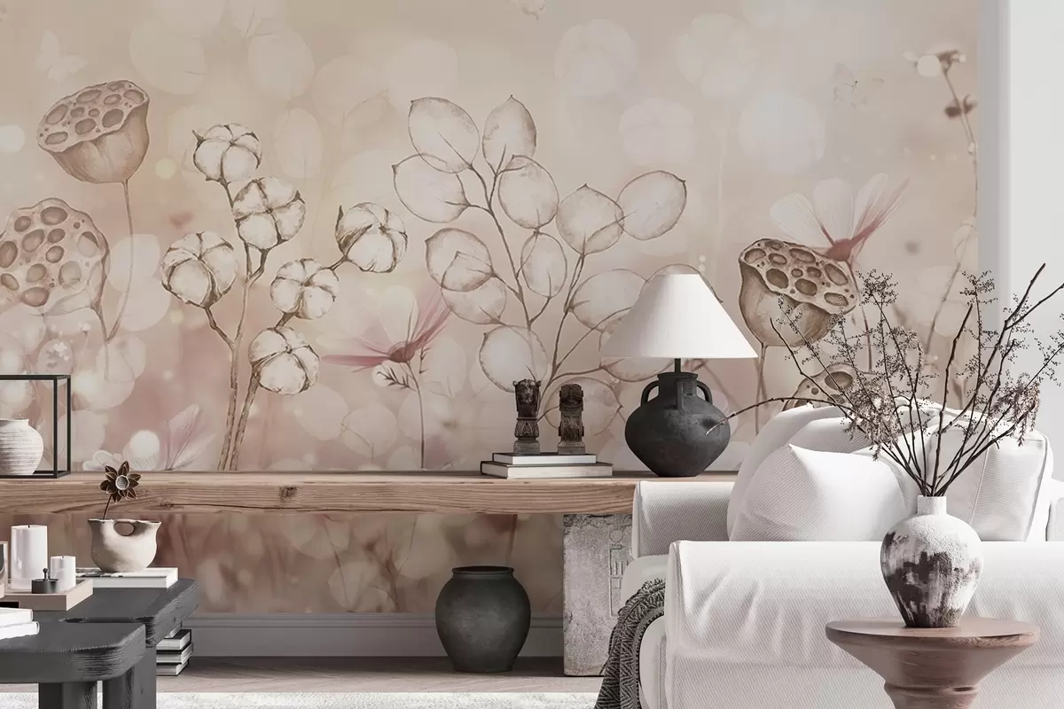 Fototapeter Drømmende blomsterhage, sommerfugl, bomullsblomster, lotusblomster, beige farger Nr. w02516v3