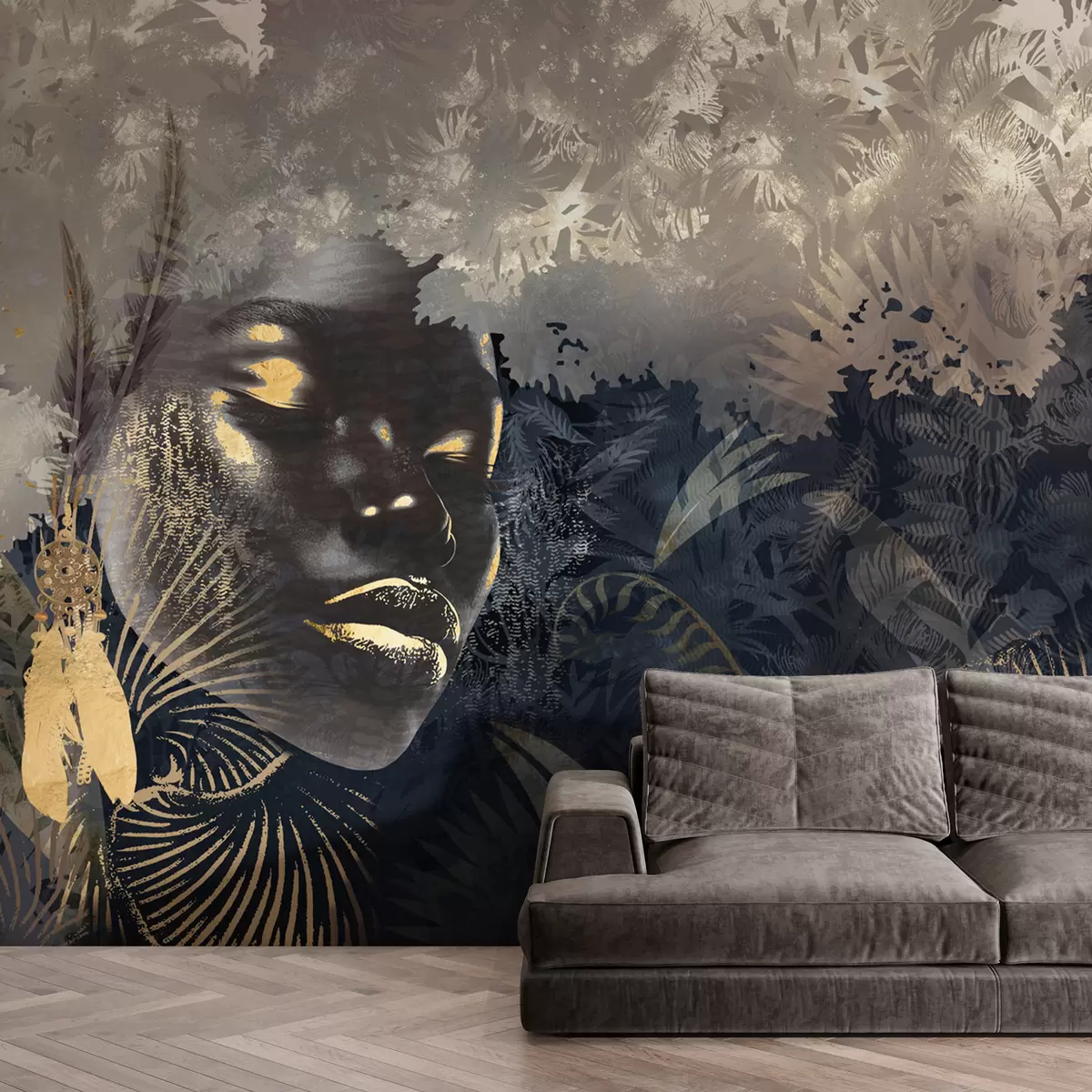 fototapeter Magisk Afrika med regnskog, jentete og vektorelementer med blå fargetone w02642v1