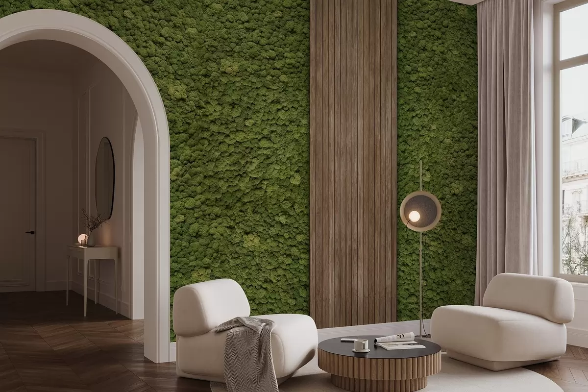Fototapeter Vegg i mosstil med trepanel, frodige olivenfarger Nr. w02656v3