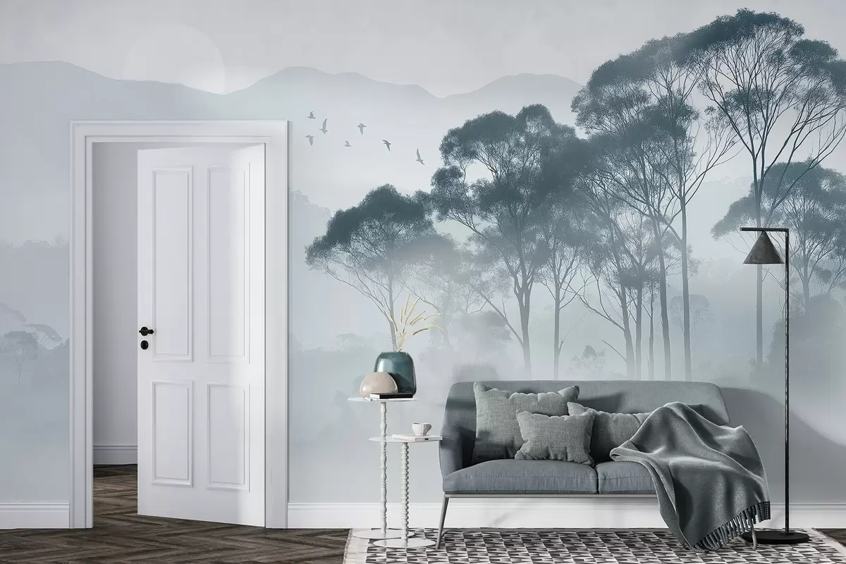 Fototapeter Trær i tåke, naturlandskap, fugler, sol, blå farger Nr. w02740v1