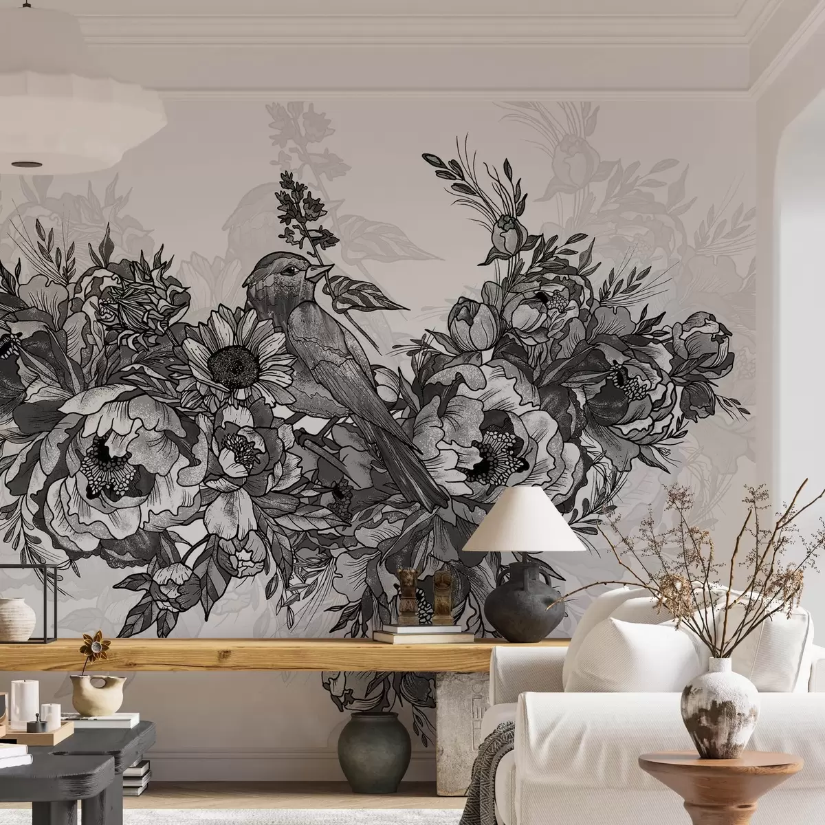 Fototapeter Monokrom blomster- og fuglekomposisjon Nr. w02834
