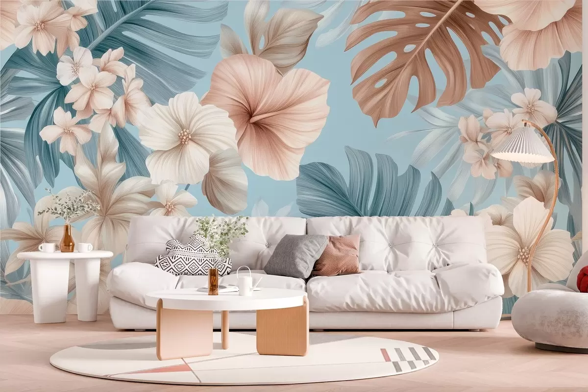 Fototapeter tropisk trykk med store blader og blomster i pastellblå og beige farger Nr. w03013