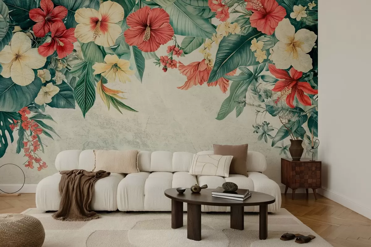 fototapeter tropiske blomster og planter som henger ovenfra på en strukturert bakgrunn w03023