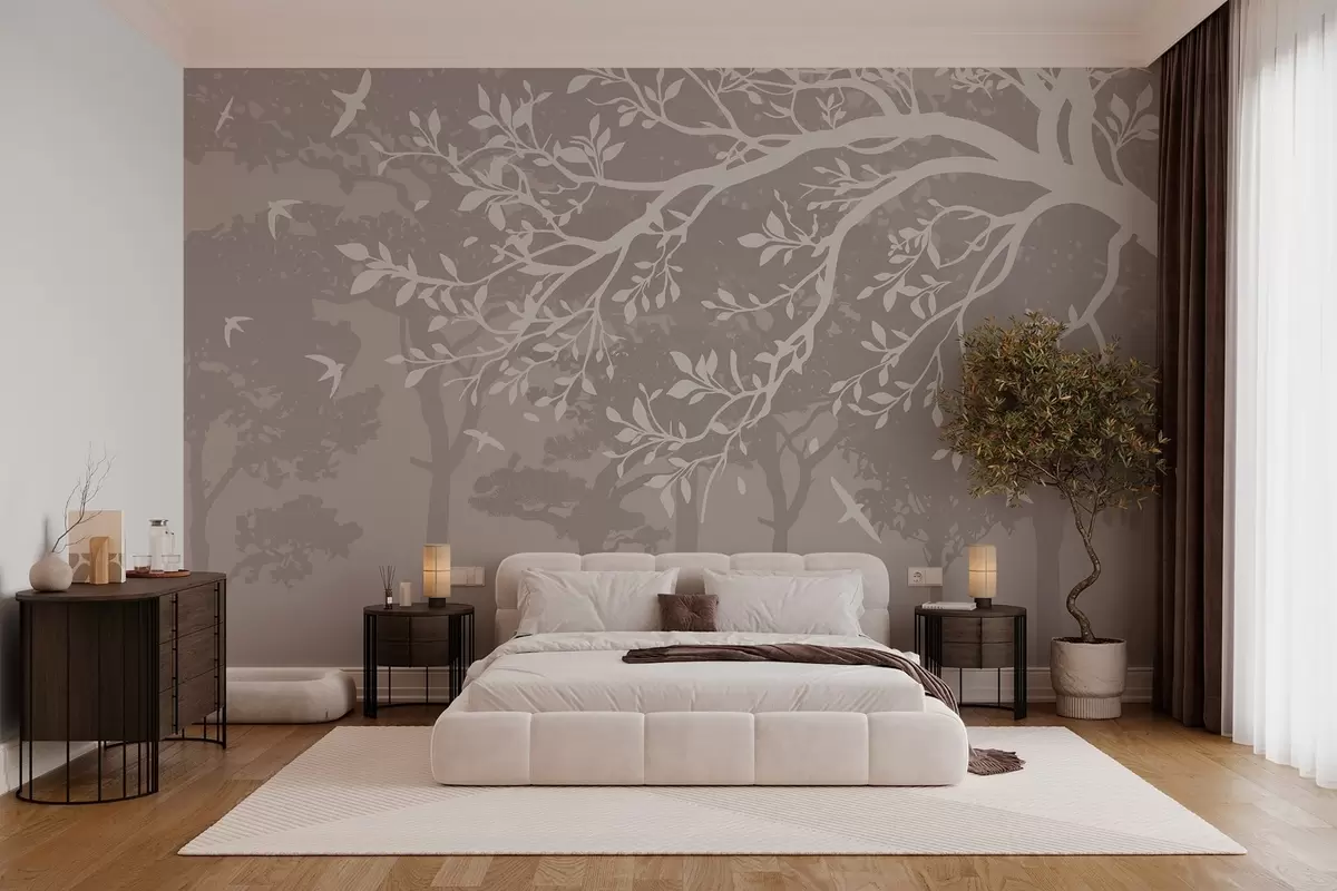 Fototapeter silhuett av en kremaktig tregren med fugler, på bakgrunn av skogen Nr. w03116