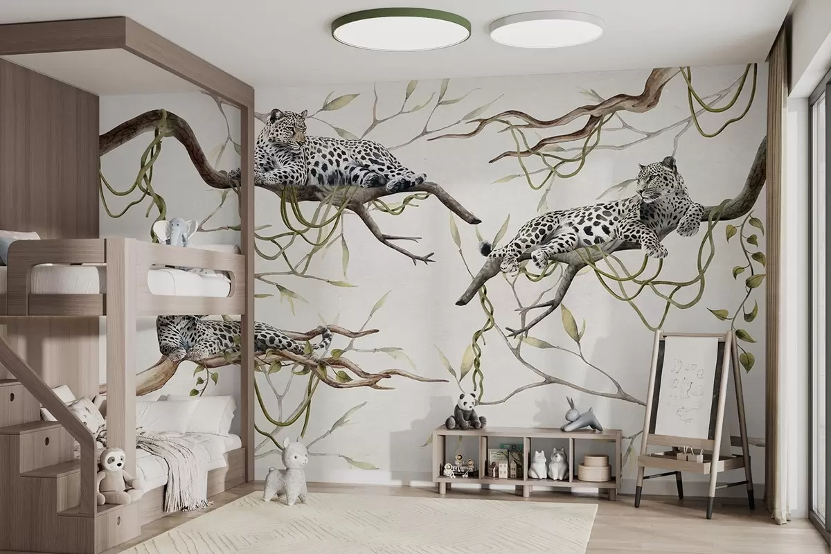 Fototapeter Leoparder på jungeltrærne, lianer, tropiske, ville dyr, pastellfargepalett Nr. w03146v4