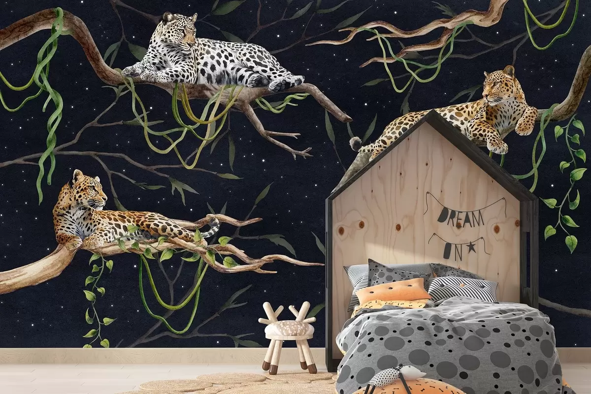 Fototapeter Leoparder på jungeltrærne, lianer, tropiske, ville dyr, nattehimmel med stjerner Nr. w03148