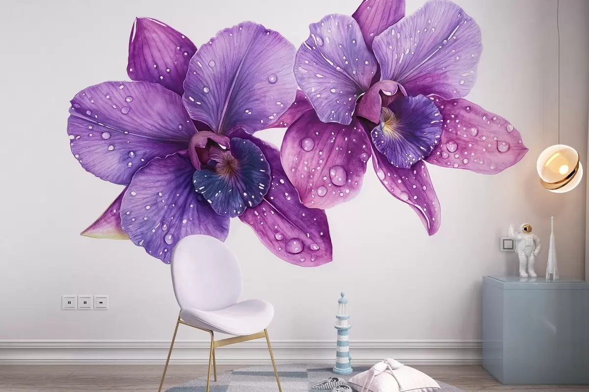 Fototapeter Vakre orkidéblomster, akvarellstil tegning, fiolette farger Nr. w03164
