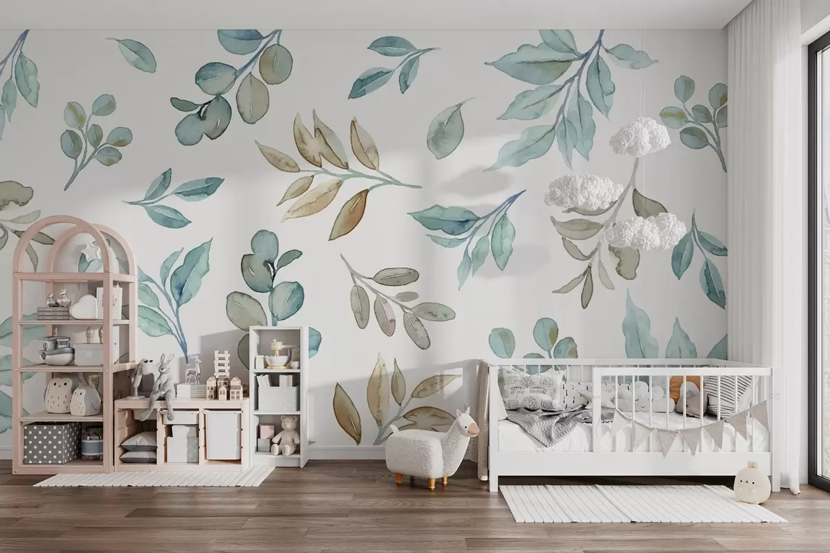 Fototapeter forskjellige blader og grener i akvarellteknikk i blå og beige toner på hvit bakgrunn Nr. w03280