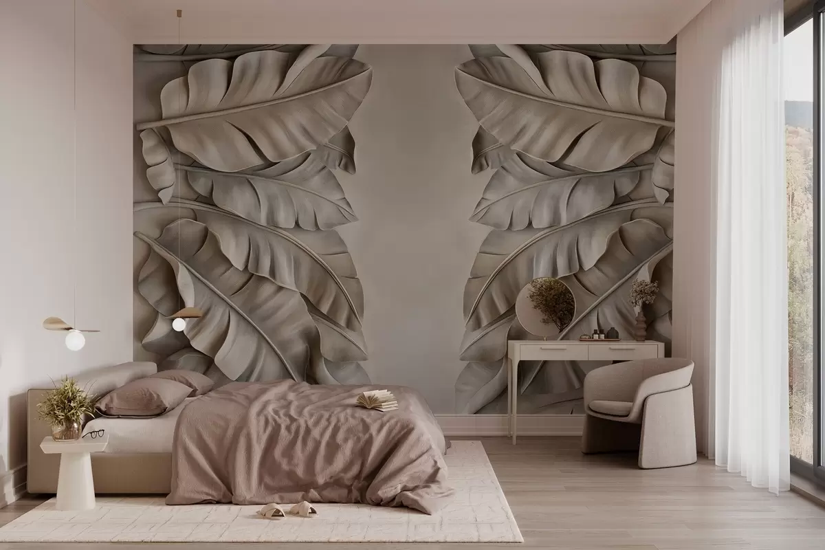 Fototapeter imitasjon av et basrelieff med tropiske blader i beige toner Nr. w03285