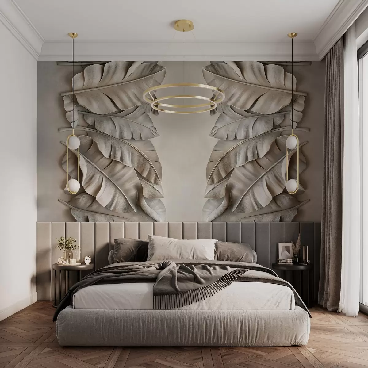 Fototapeter imitasjon av et basrelieff med tropiske blader i beige toner Nr. w03285