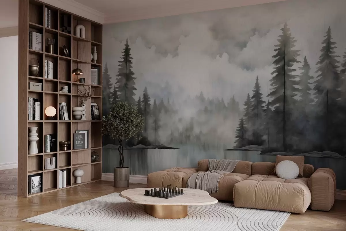 Fototapeter Skog, innsjø og overskyet himmel i akvarellstil Nr. w03387