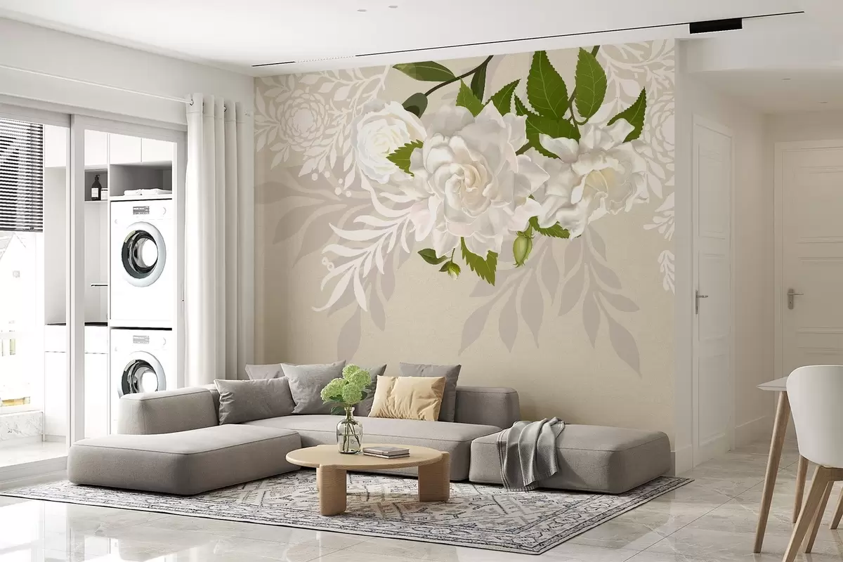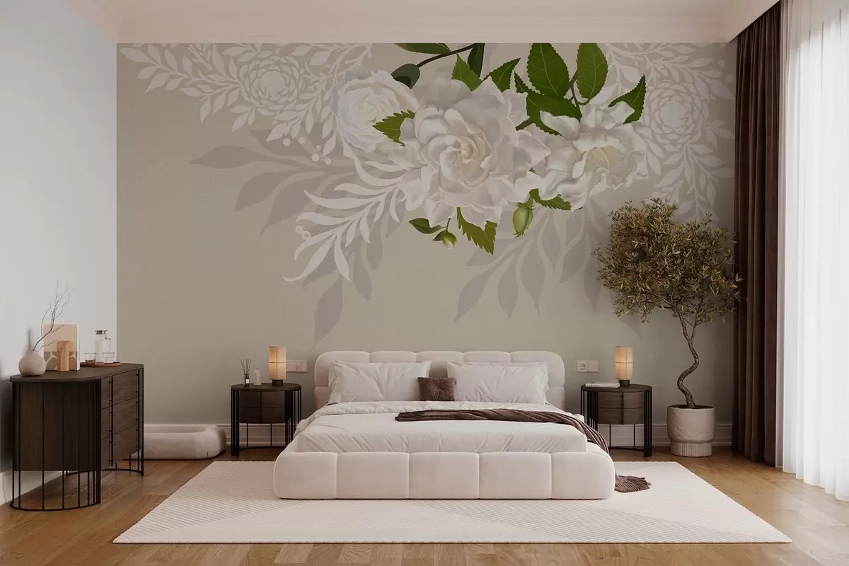 Fototapeter hvite roser på beige mønstret bakgrunn Nr. w03453