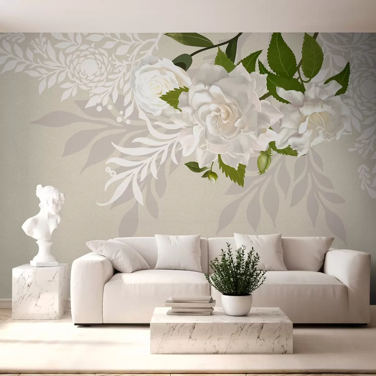 Fototapeter hvite roser på beige mønstret bakgrunn Nr. w03453