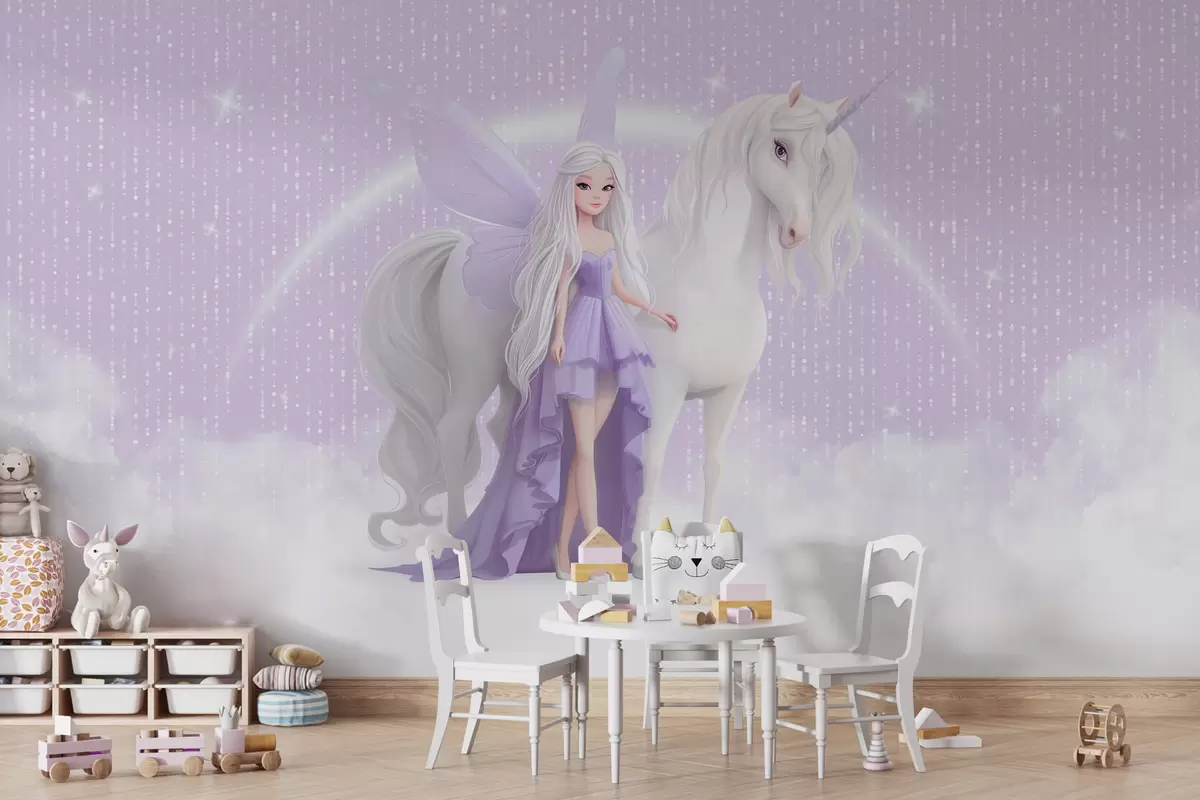 Fototapeter En fe med en enhjørning blant skyene Nr. w03527