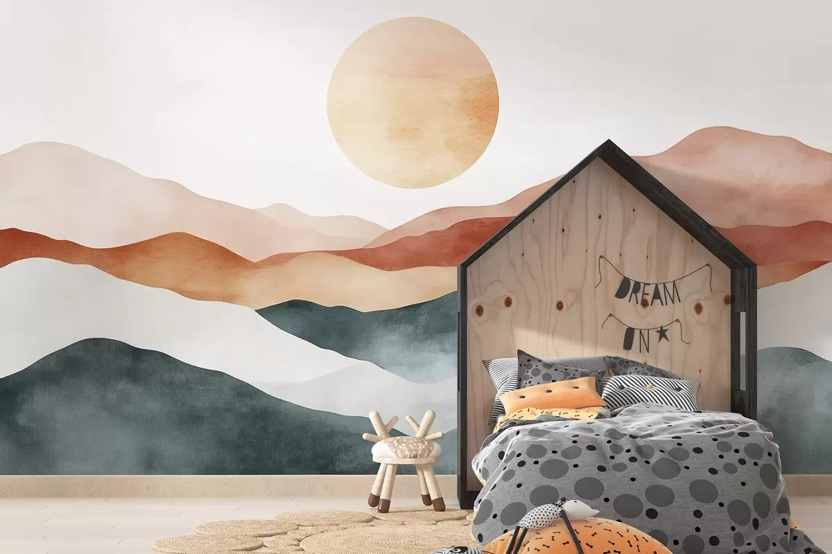 Fototapeter Akvarellfjell med solen, boho-stil, rød, oransje, grå Nr. w03551