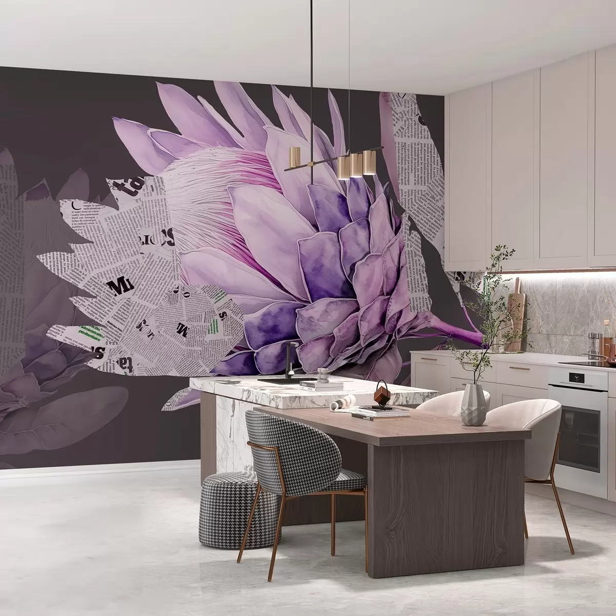 Fototapeter Proteablomster, aviskunst, blomster, tropisk, mørk bakgrunn, lilla farger Nr. w03667v2