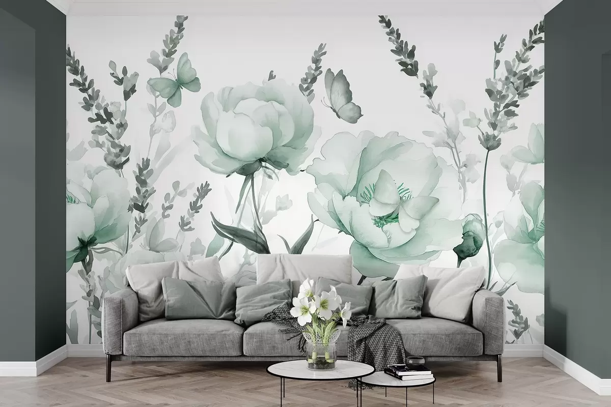 Fototapeter Blomstereng, pioner, lavendel, sommerfugler, akvarellstil, grønne farger Nr. w03668v1