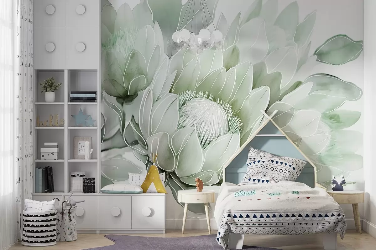 Fototapeter Vakre proteablomster, strektegning, tropiske, grønne farger Nr. w03669v2