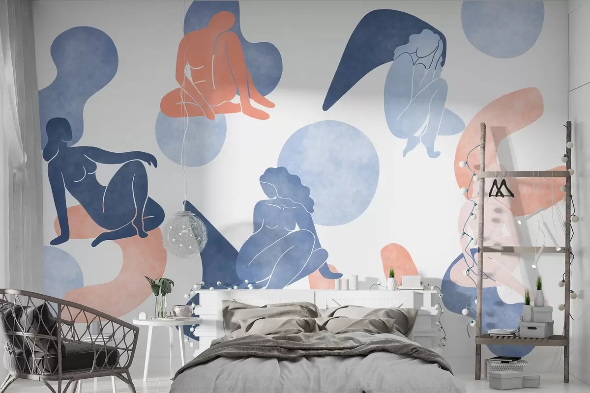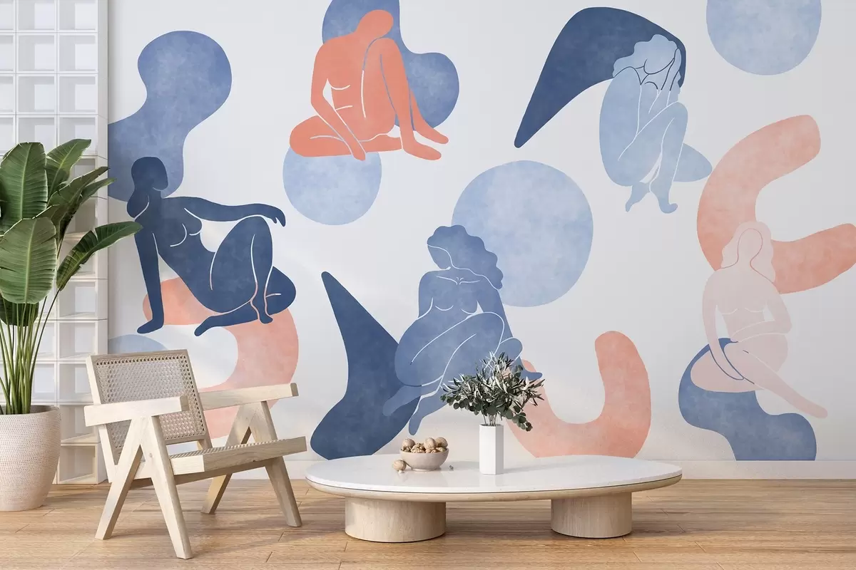 Fototapeter Geometriske abstraksjoner med kvinnesilhuetter, boho-stil, blå, beige, rosa Nr. w03753v1
